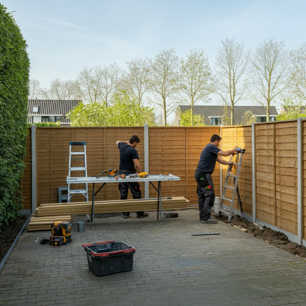 De prijs hangt vooral af van het materiaal (hout, hout-beton of composiet), de hoogte, totale lengte, het aantal hoeken en extra’s zoals poorten of luxe schermen. De ondergrond en toegankelijkheid (bijvoorbeeld via een zijpad) spelen ook mee in de montagekosten. We lichten in onze offerte helder toe wat elk onderdeel kost en welke alternatieven er zijn (budget, standaard, premium). Voor een exacte prijs maken we graag een offerte op maat.